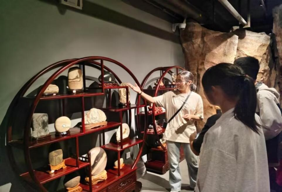 随后,新生们移步地质博物馆。在讲解员的细致引导下,大家近距离观察各类展品:从数十亿年前的古老生物化石,到色彩斑斓的矿物晶体、形态各异的岩石标本,再到极具科研价值的陨石样本,每一件展品都吸引着新生的目光。同学们不时俯身观察细节,有的拿出笔记本记录展品信息,有的向讲解员提问“这些化石是如何形成的”“不同岩石的地质成因有何区别”,现场互动氛围热烈。讲解员耐心解答疑问的同时,还结合安顺当地地质特征,介绍了区域内独特的地质地貌与自然资源,帮助新生快速了解求学所在地的自然文化风貌。