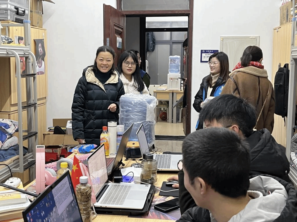 2023年2月19日晚,经济与管理学院党委书记张红霞带领班主任吕小艳、王典雪、周羿、杨皓亮、罗迅等老师,以及学生会干部开展新学期学生宿舍走访活动。